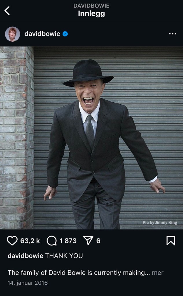 Bowie som bare et par dager tidligere hadde kommet med et nytt album. Med Blackstar hadde han levert et nytt mesterverk. Så døde han. NRK spilte sangen Starman i innslaget på radioen, en av hans beste sanger. Det var sangen som virkelig gjorde ham til stjerne da han fremførte den på Top of The Pops i 1972: